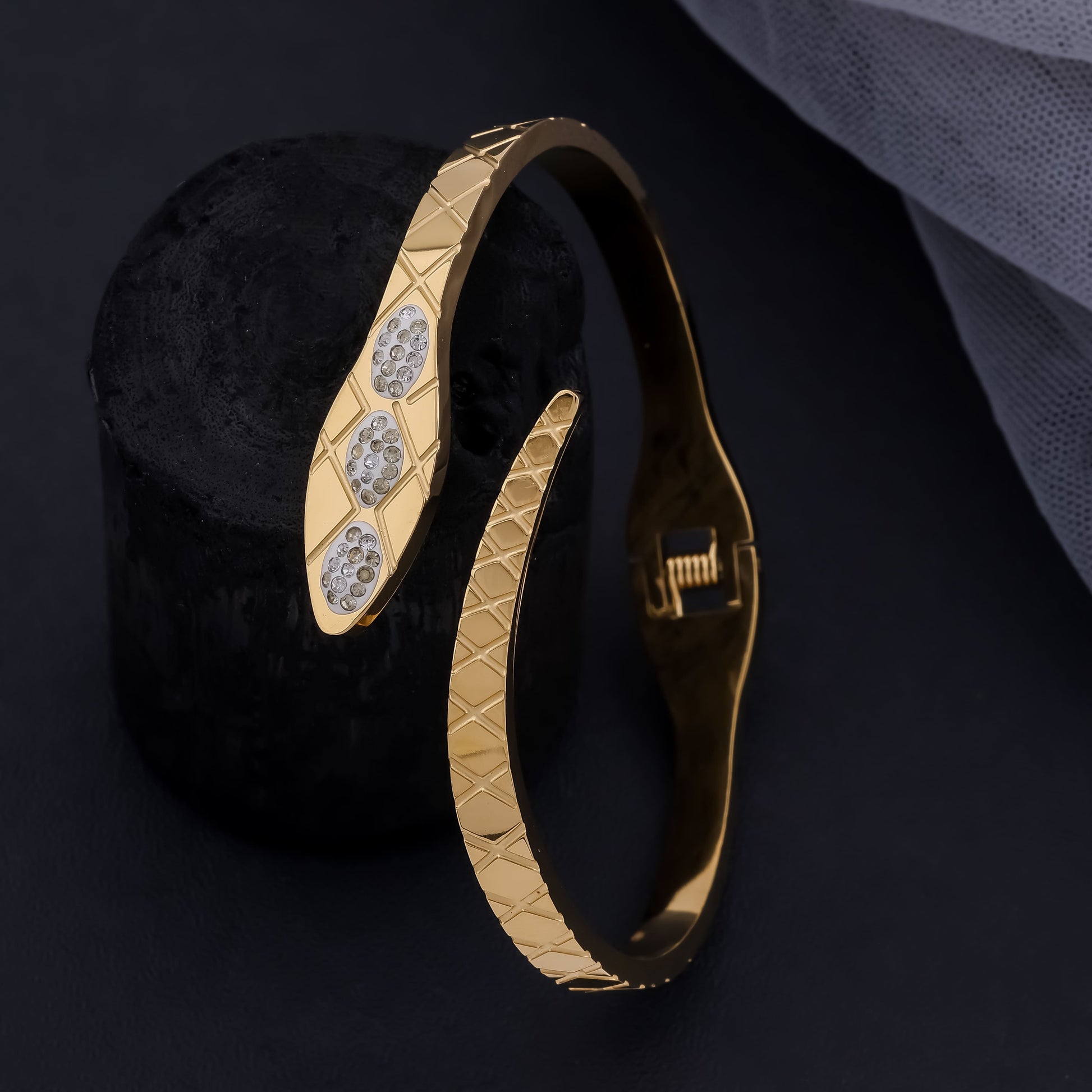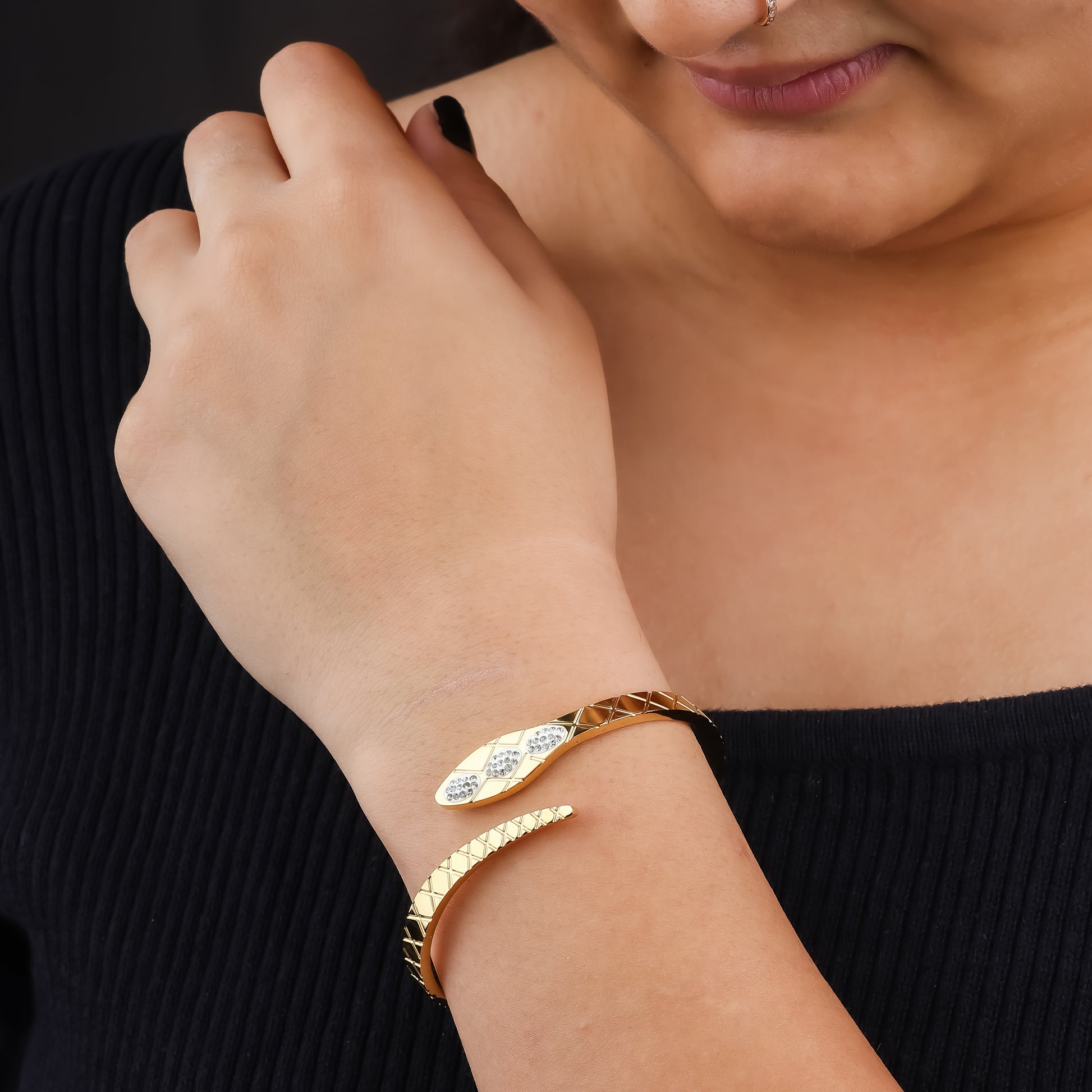 Exude sophistication with this serpent-inspired Kada bracelet, featuring a spiral band with etched geometric patterns and diamond-accented headpieces. Its open-ended design allows easy wear while creating a statement of modern elegance. Perfect for adding a touch of luxurious style to both daywear and evening looks.