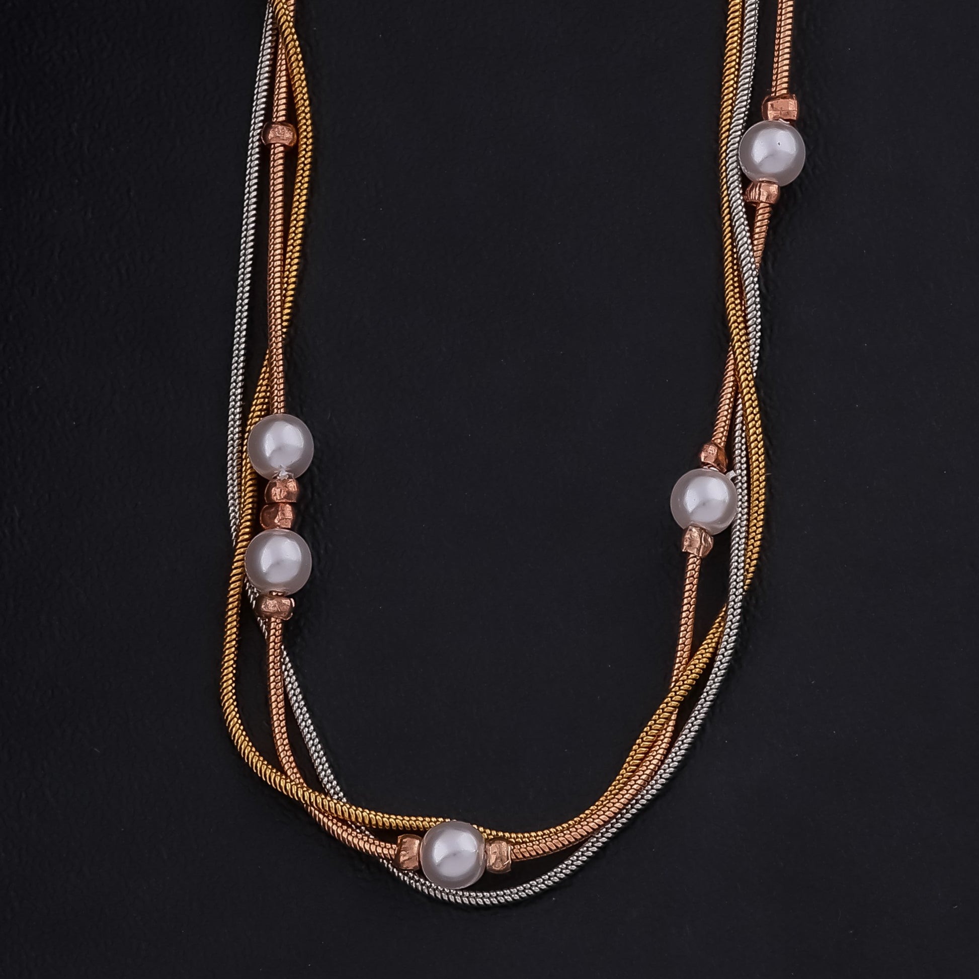 Three delicate chains come together in perfect balance, with one strand softly dotted with spaced motisāeach reflecting gentle grace. This layered beauty offers a refined yet striking look, blending tradition with a touch of modern flow. A piece that feels as light as it looks, designed to make every movement glow. Ideal for daily wear or quiet festive charm.