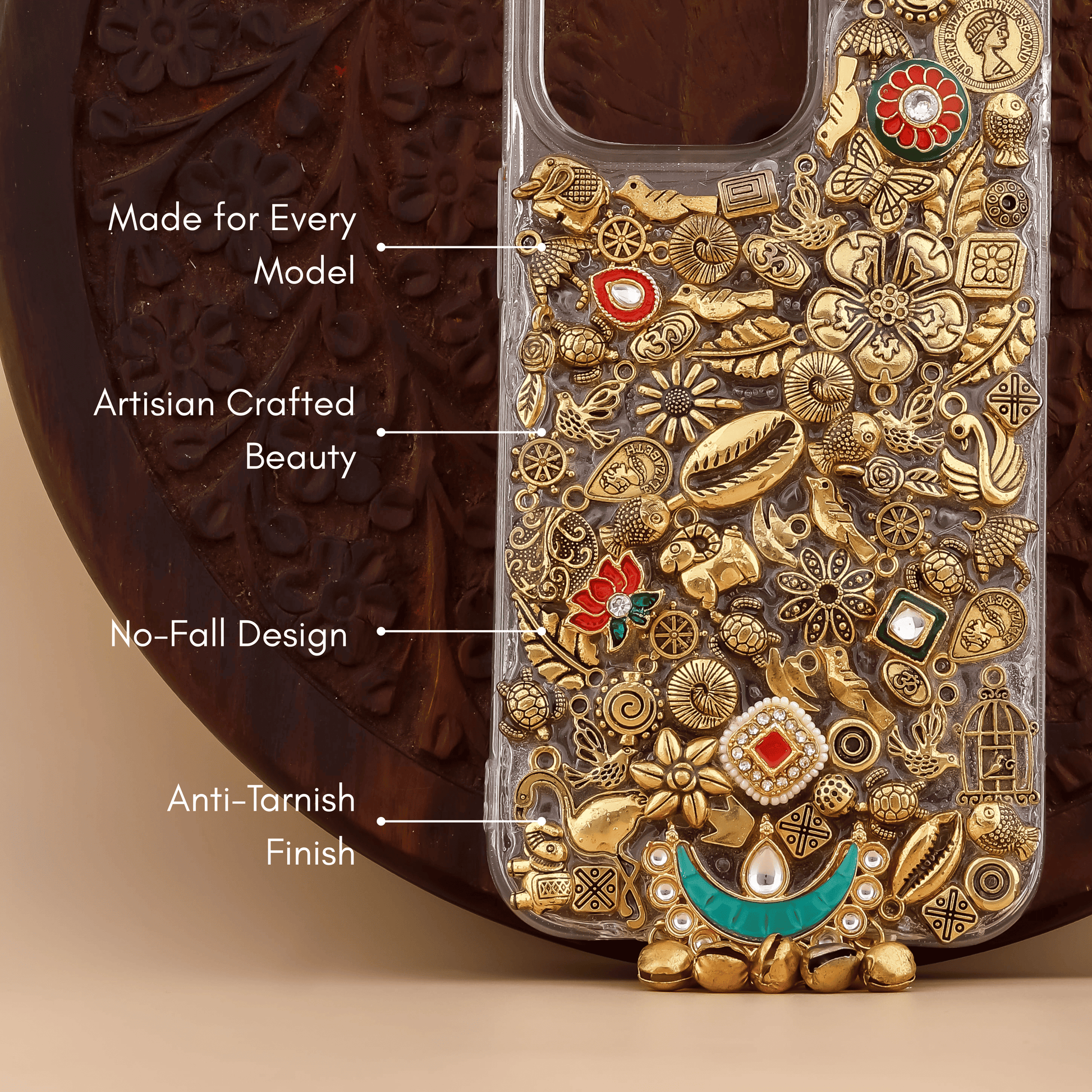 Material: Precious Alloy Color: Transparent Cover & Golden Work: Handcrafted with Shine Detail Weight: Approx. 100g Fit: Choose Model from variation Functionality: No Blocking – Use All Buttons, Charging & Cables