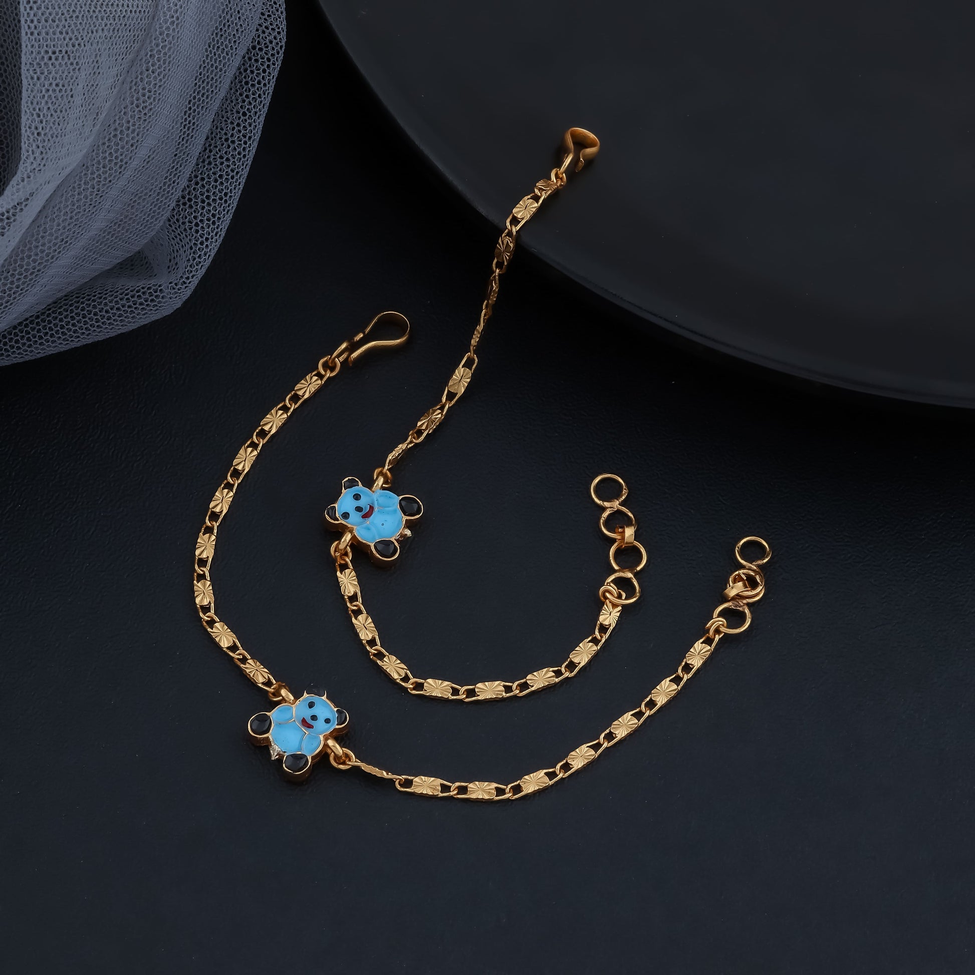 Color: Yellow Gold Material: Precious Alloys Size: Each 12 cm + 2 cm Adjustable Age Group: 3 Months to 8 Years Gender: Unisex (Boy & Girl) No. Of Products: 2 ( 1 Pair )