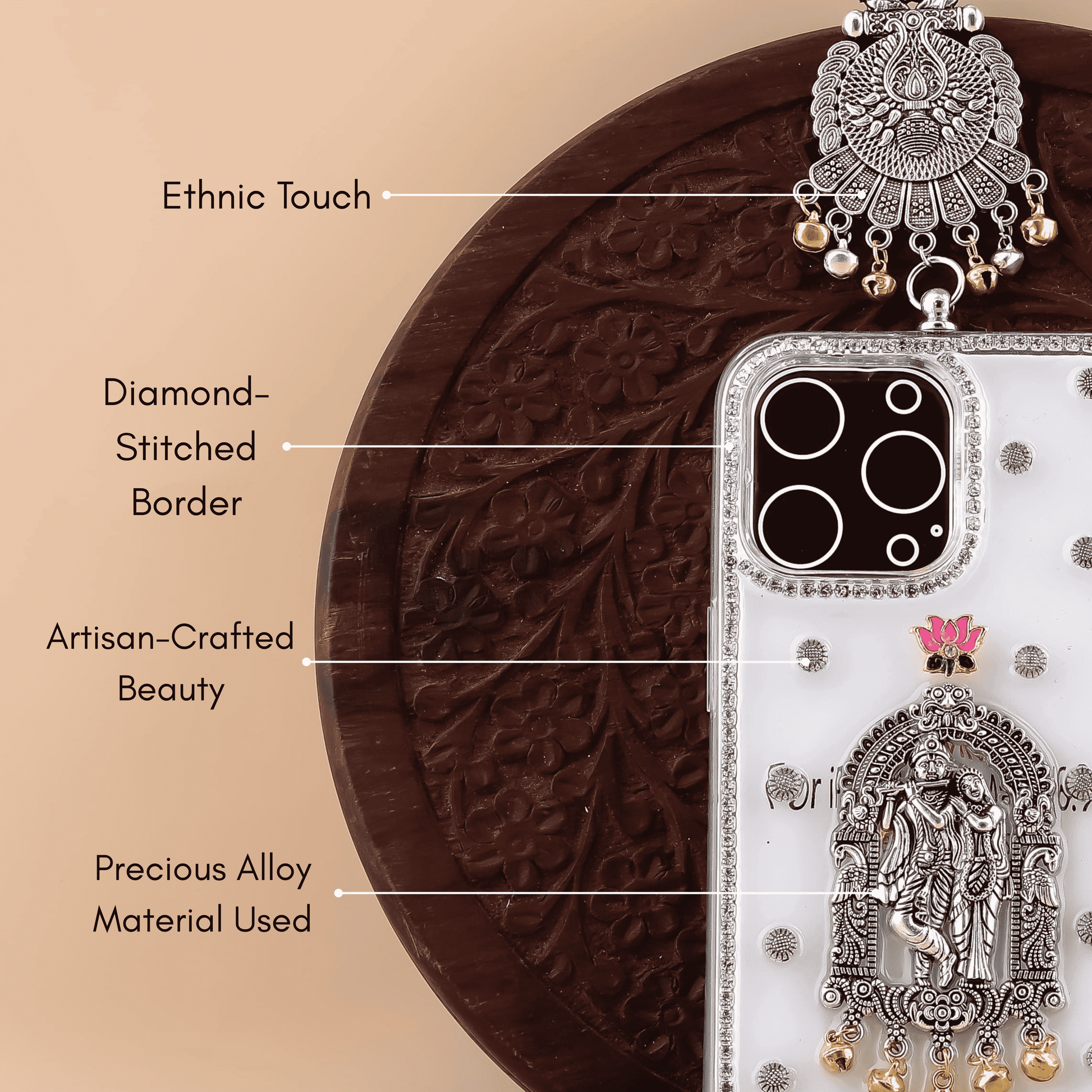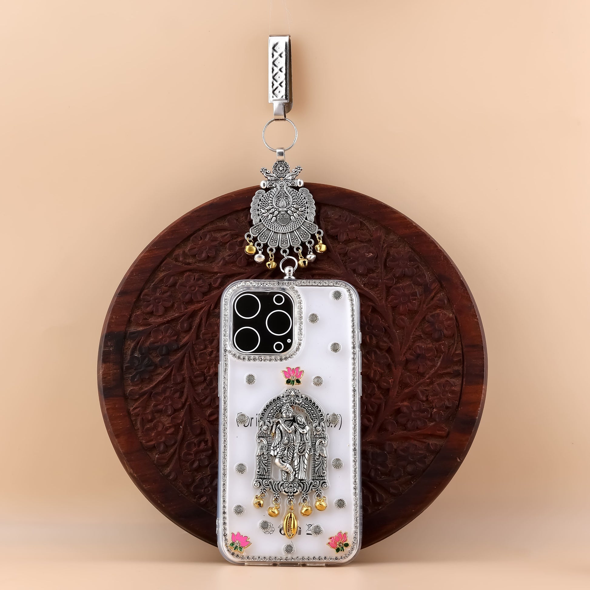 A spiritual statement in silver — divine Radha Krishna, golden leaf ghoonghris, and a luxe hanging hook create a design that radiates blessing, beauty, and grace. Whether you're out for coffee or capturing mirror selfies, this case adds a soft glam that feels luxurious, feminine, and uniquely you.