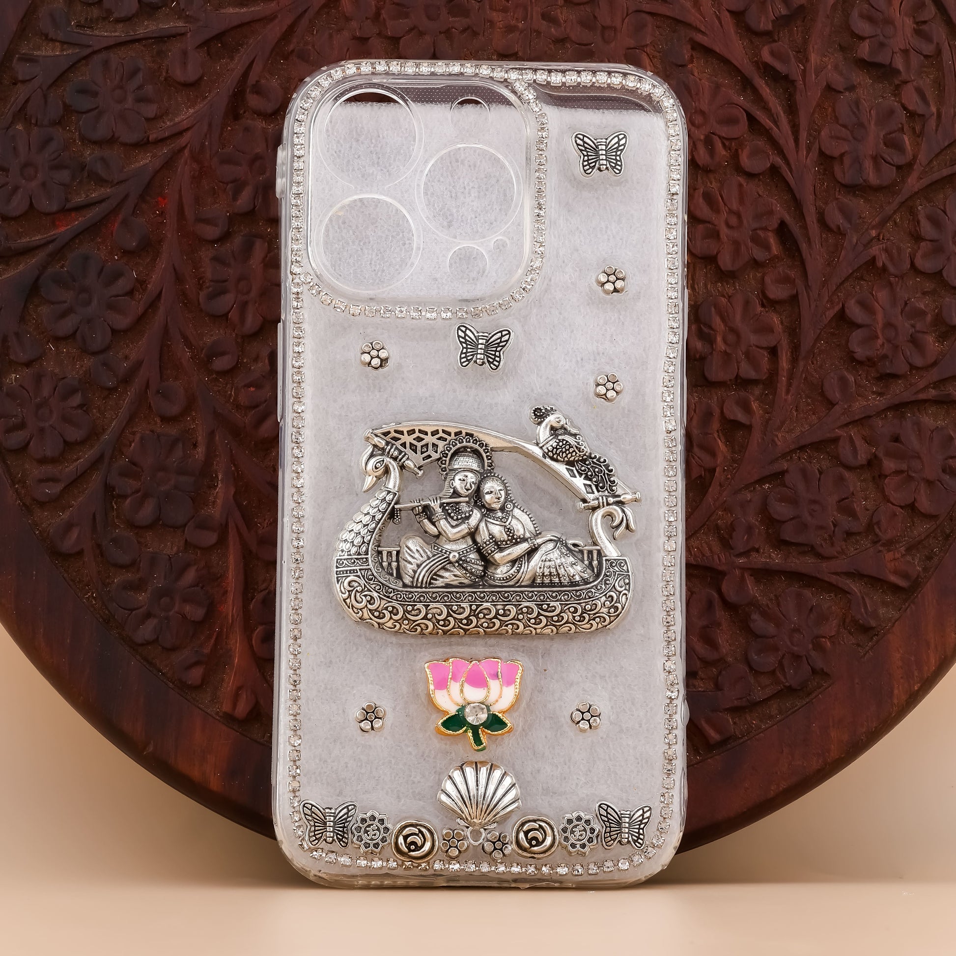 A sacred journey in your hand—Krishna Radha resting on an intricately carved boat with crane, tail, and peacock details crowned by a rose. Perfect for temple days or café meetups, this cover celebrates layered artistry, devotion, and cultural spirit that's uniquely yours.