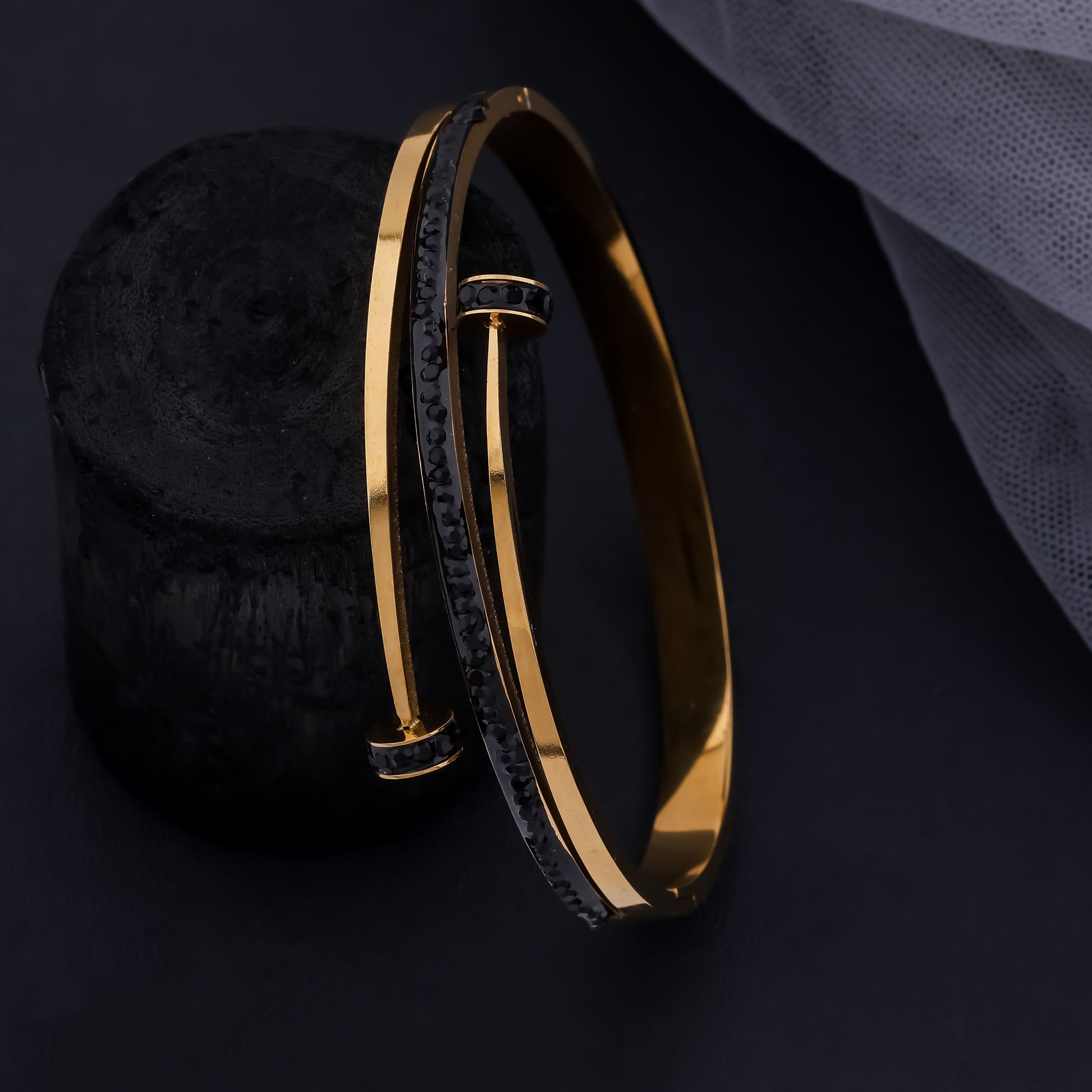 Make a bold statement with this contemporary Kada bracelet, featuring a sleek gold band accented by a black-studded central strip and nail-inspired detailing. Its modern design blends sophistication with edge, perfect for elevating both casual and evening ensembles. A versatile piece that stands out while remaining elegant and timeless.