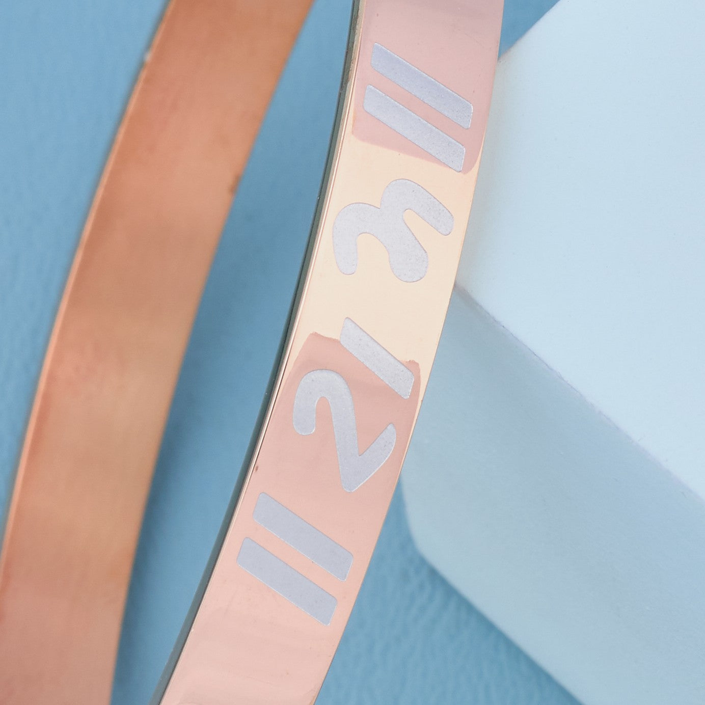 A sleek rose gold kada etched with Roman numerals—minimal in design, rich in presence. A statement for men who value timeless moves.