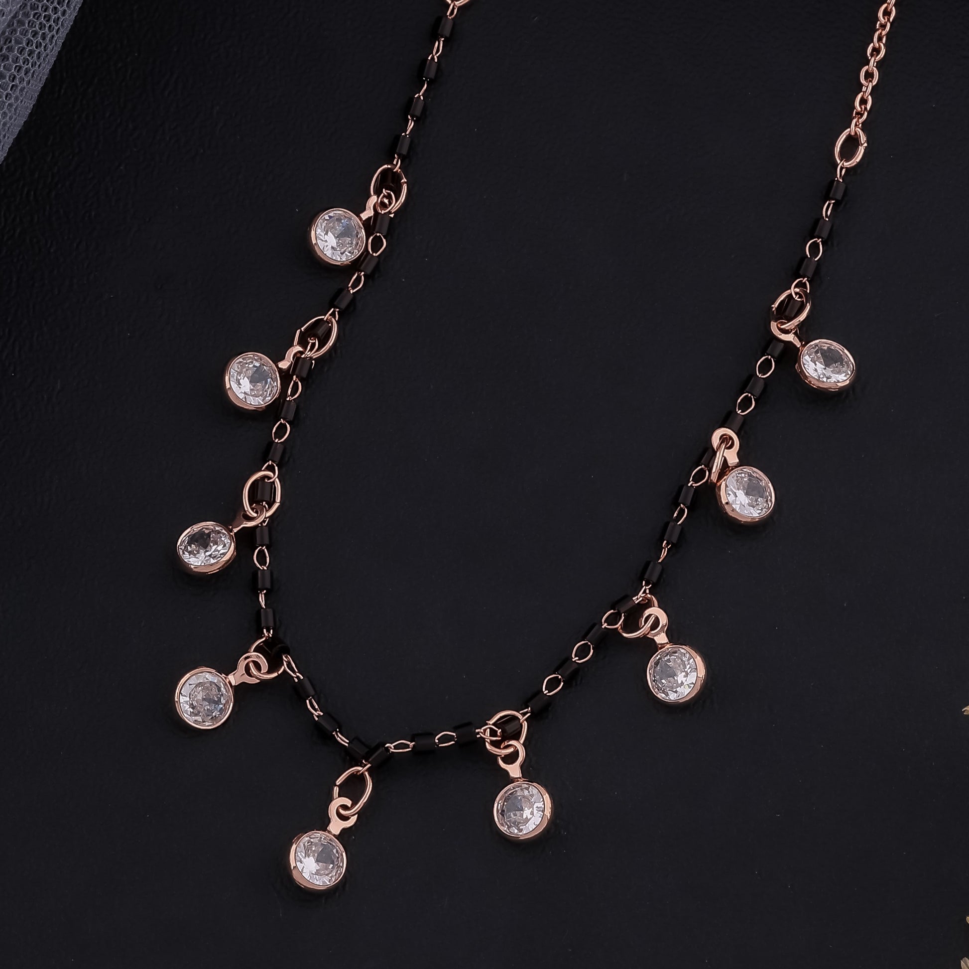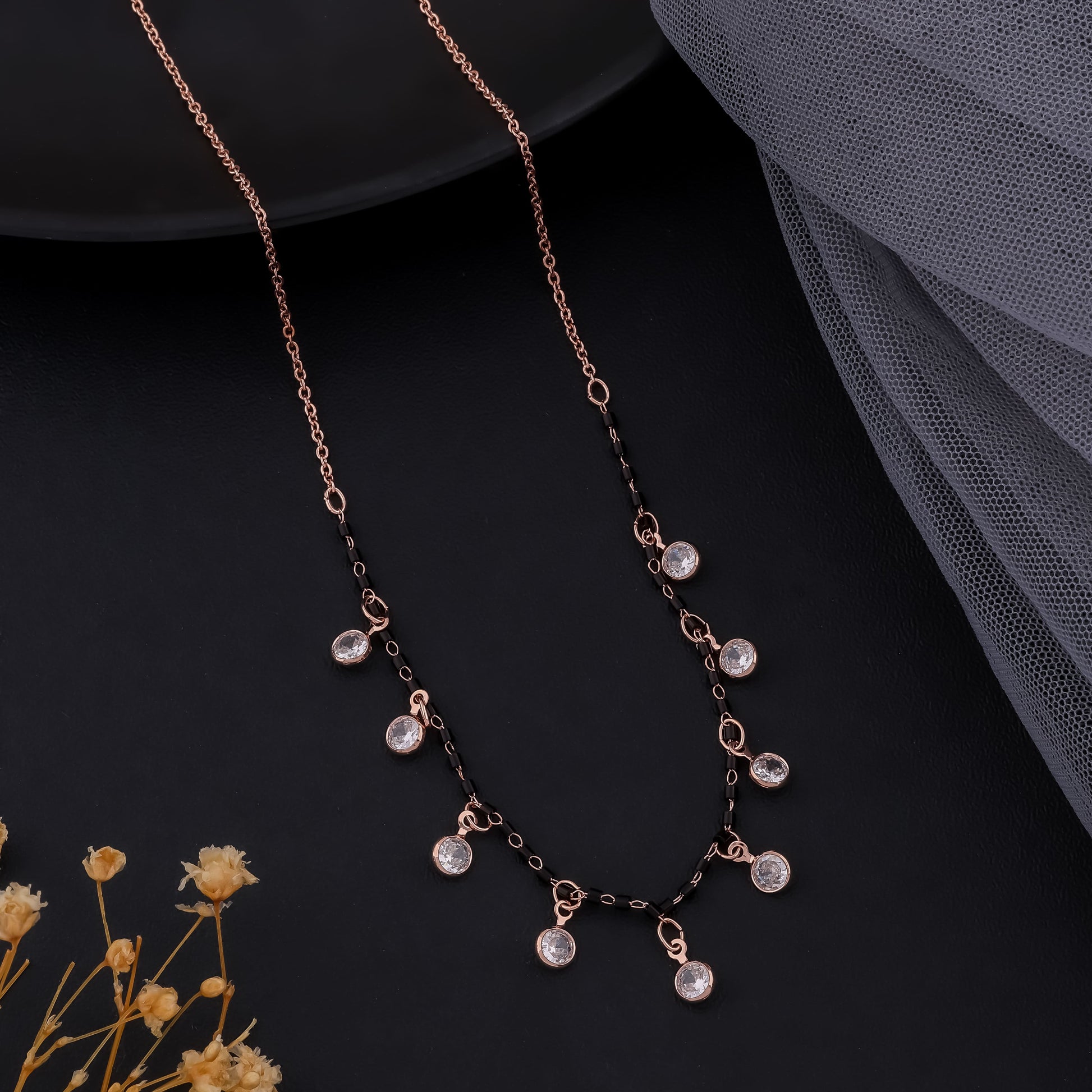 A graceful fusion of tradition and shimmer, this necklace features a dainty black-beaded chain accentuated with delicate diamond-finished drops. Each charm sways softly with your movement, adding an elegant sparkle that suits both everyday looks and special moments. The piece offers a contemporary take on the classic mangalsutra silhouette—lightweight, versatile, and full of charm. Perfect for those who seek timeless beauty with a modern edge.