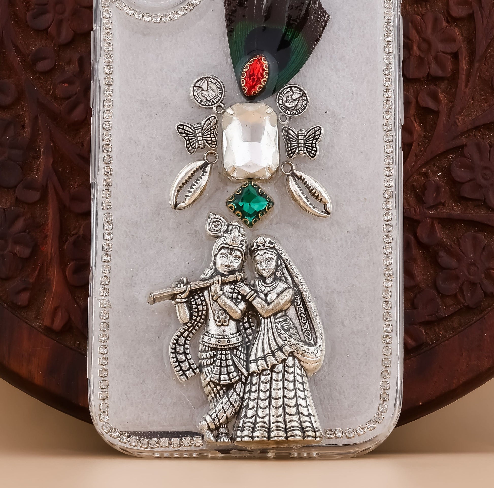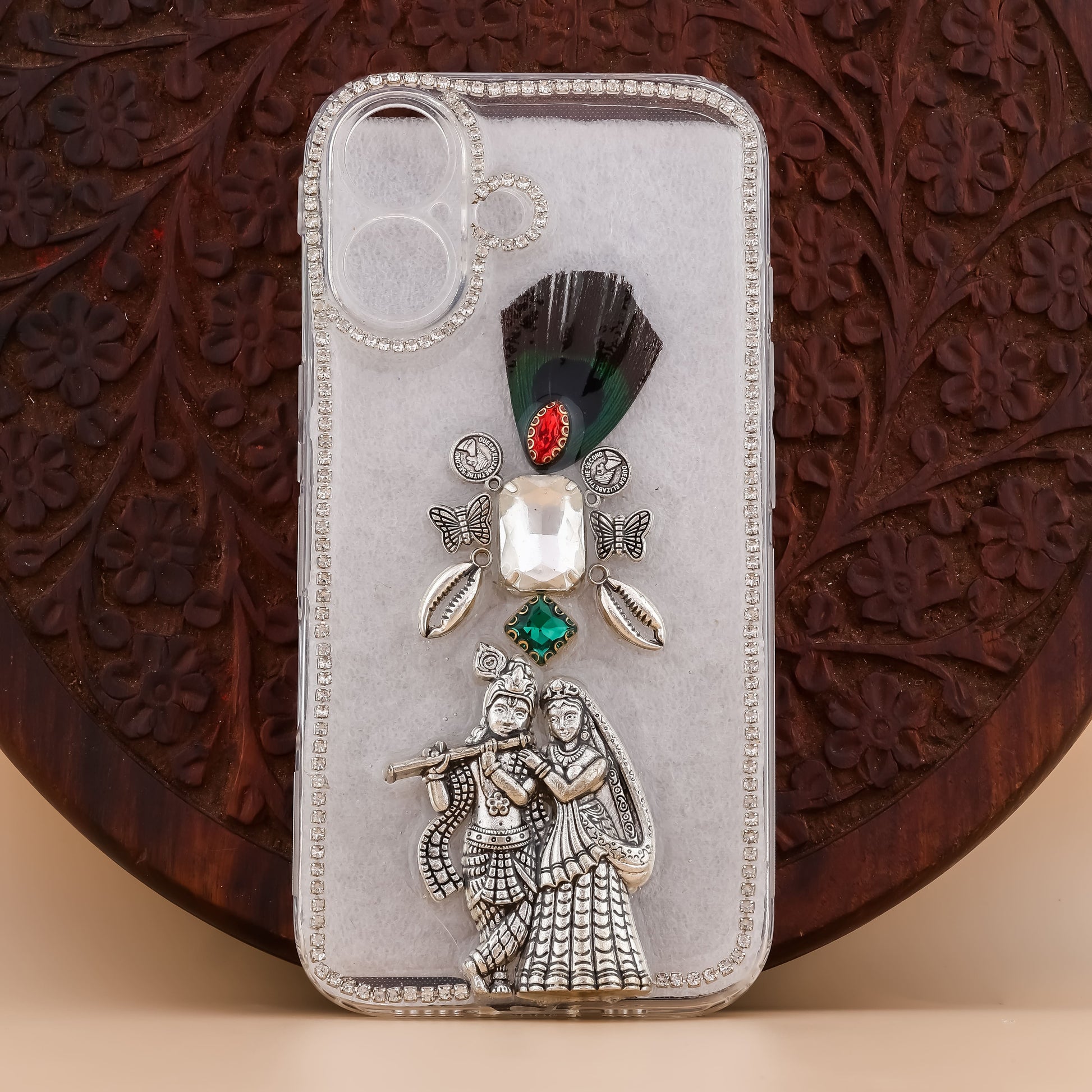 A soulful keepsake in your hand—Radha Krishna in their timeless pose, topped with a peacock feather that whispers devotion. Perfect for prayer evenings or lazy afternoons, this cover blends sacred tradition, artistry, and quiet elegance that feels deeply personal.