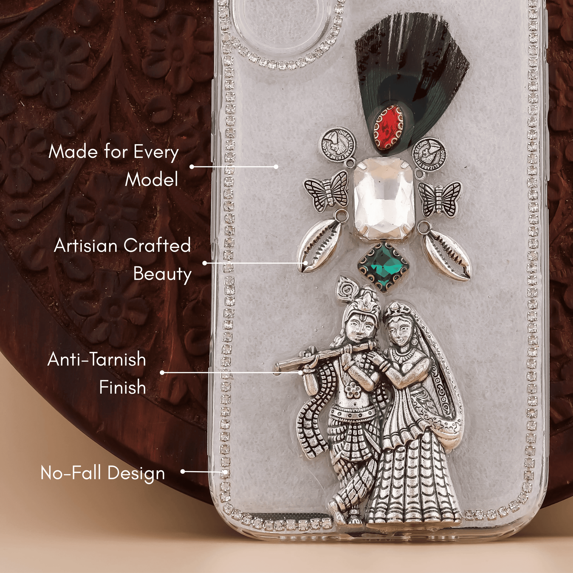 Material: Precious Alloy Color: Transparent Cover & Golden Work: Handcrafted with Shine Detail Weight: Approx. 100g Fit: Choose Model from variation Functionality: No Blocking – Use All Buttons, Charging & Cables