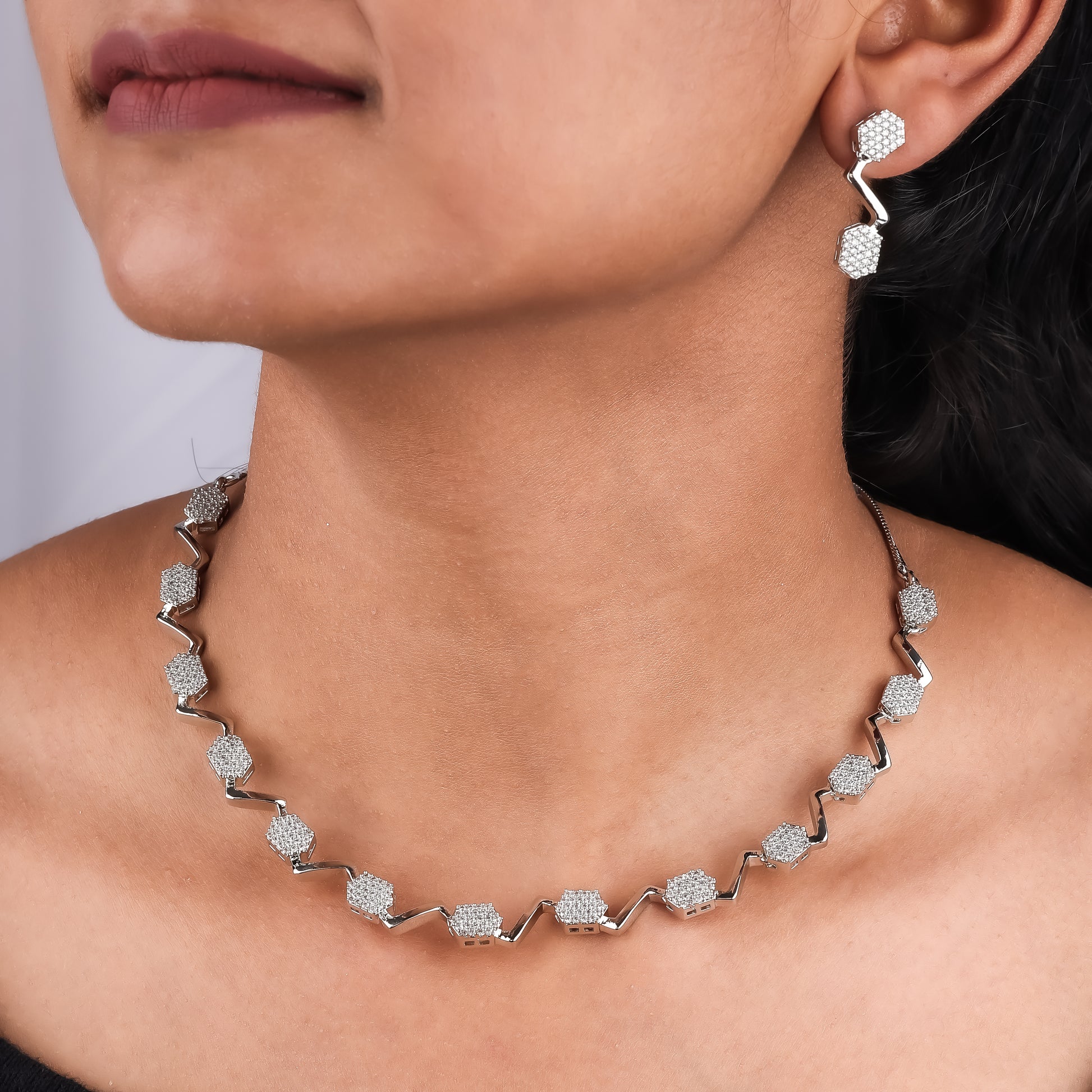 Color: Silver Material: Brass, Rhodium Finish Set Includes: With Earrings Size: 16-18 Inch (Adjustable) Clasp Type: Hook-and-Eye, AdjustableDiamond: Premium Cubic Zirconia Specification: Premium Quality Silver-Tone Shine